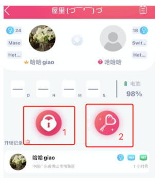 After the Keymaster enters, the page is as follows. The Keymaster can tap button 1 to remotely unlock. The Cellmate around the wearer will automatically unlock. Button 2 will be introduced below.